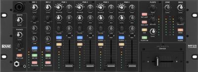 2 Rane MP25 DJ Mixers. Mixers are a fairly simple item but are the heart of the system and have to be reliable, and produce clean sound. Cheap ones just don't work. (www.rane.com) |